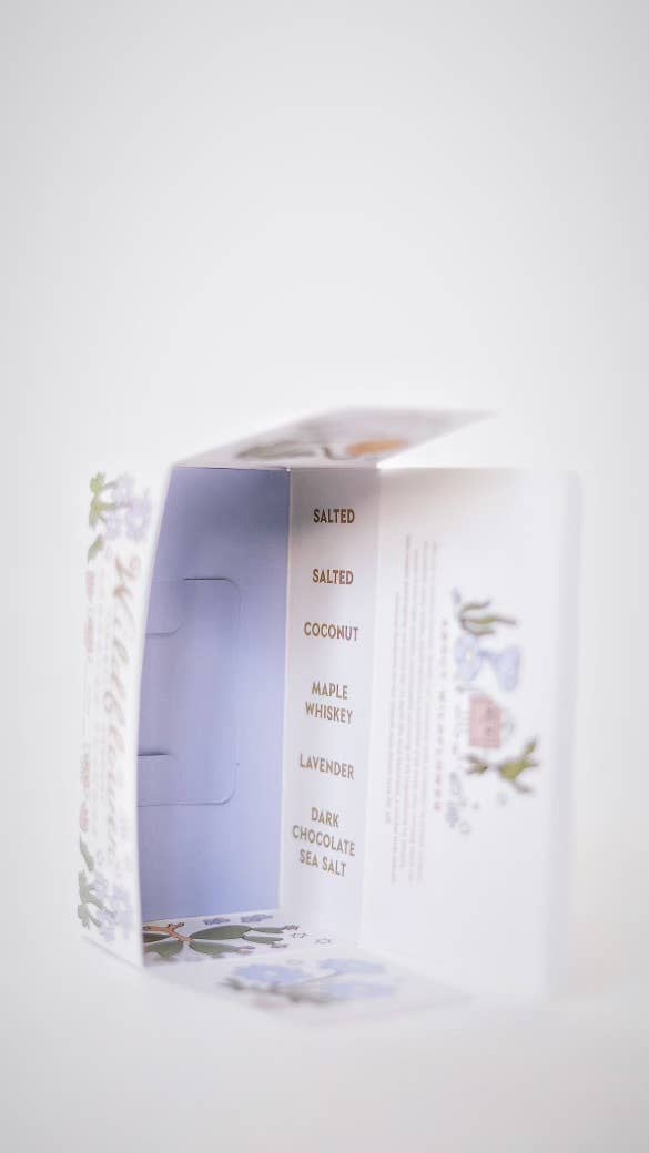 This beautifully illustrated box is the perfect intro to our caramels. It includes 6 pieces of our most popular flavors - Salted (2 pcs), Coconut, Maple Whiskey, Honey Lavender, Dark Chocolate + Sea Salt.
