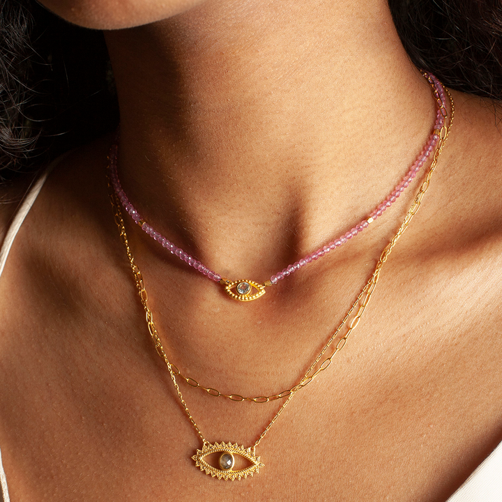 Shielded from nefarious forces, you walk bathed in positivity and protection. An 18k gold plate gold necklace is anchored with a stunning evil eye pendant—symbol of intuition and protection—that gleams with blue topaz, stone of wisdom and communication.