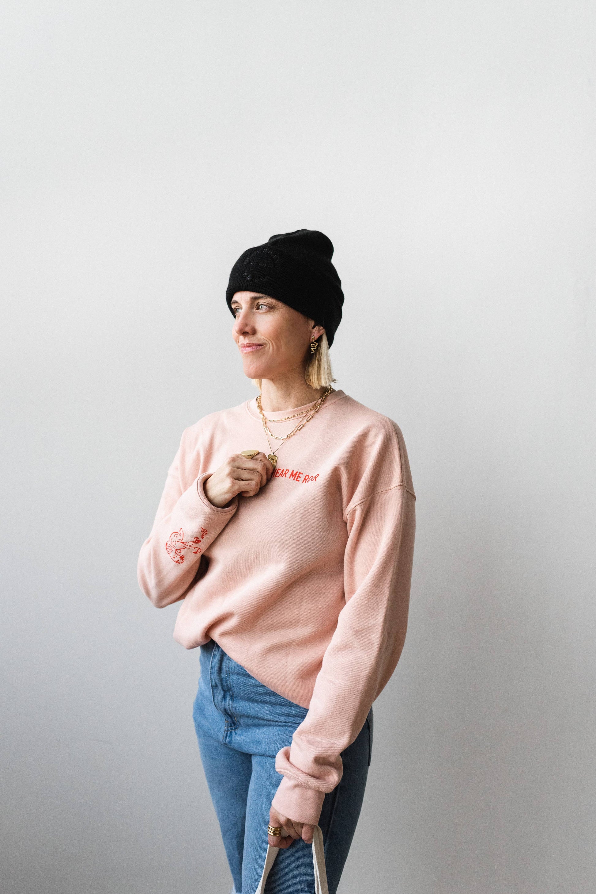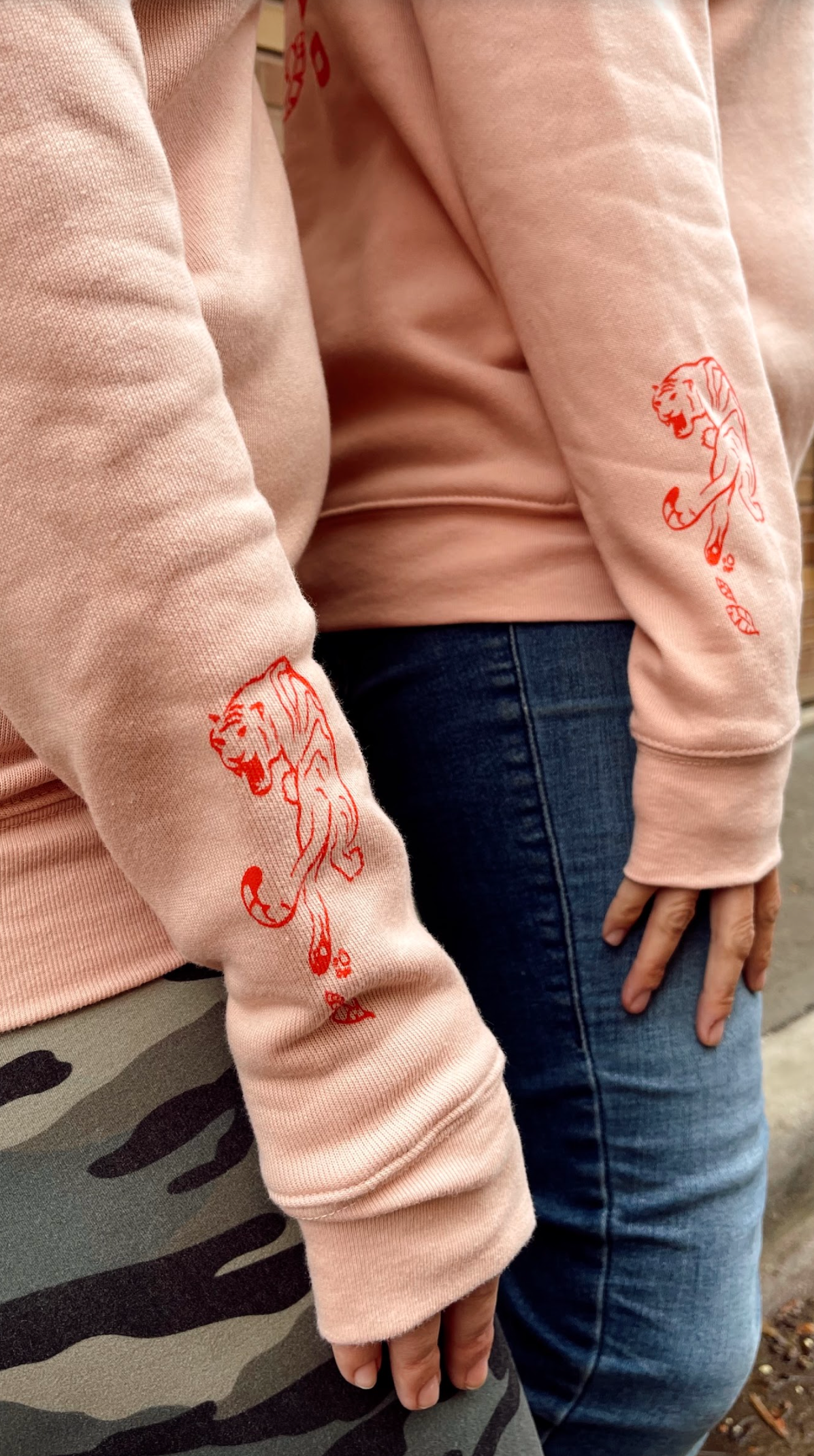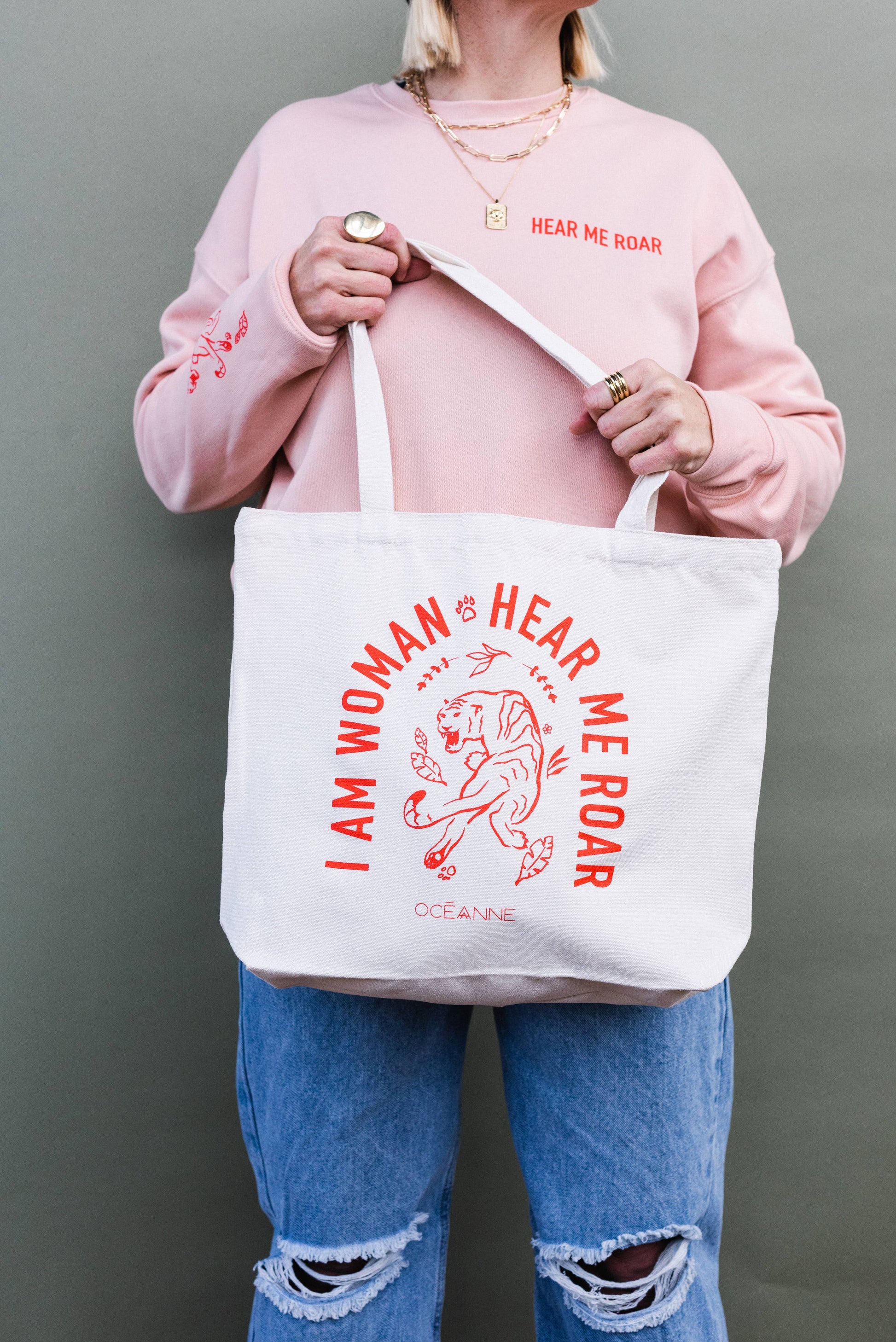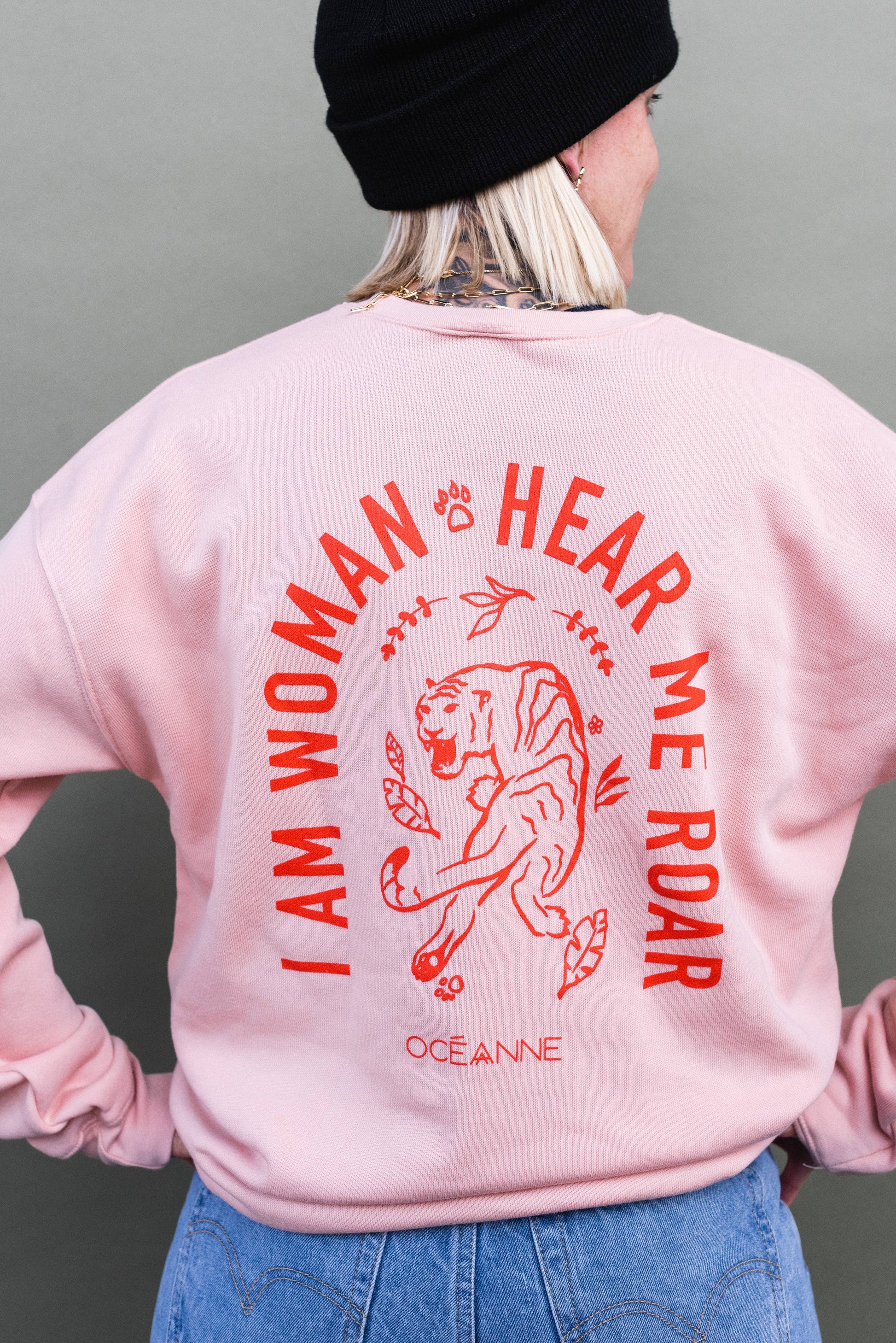 "Hear Me Roar" printed on the front left pocket with roaring tiger and "I Am Woman Hear Me Roar" printed on the back // Printed tiger on the bottom right sleeve