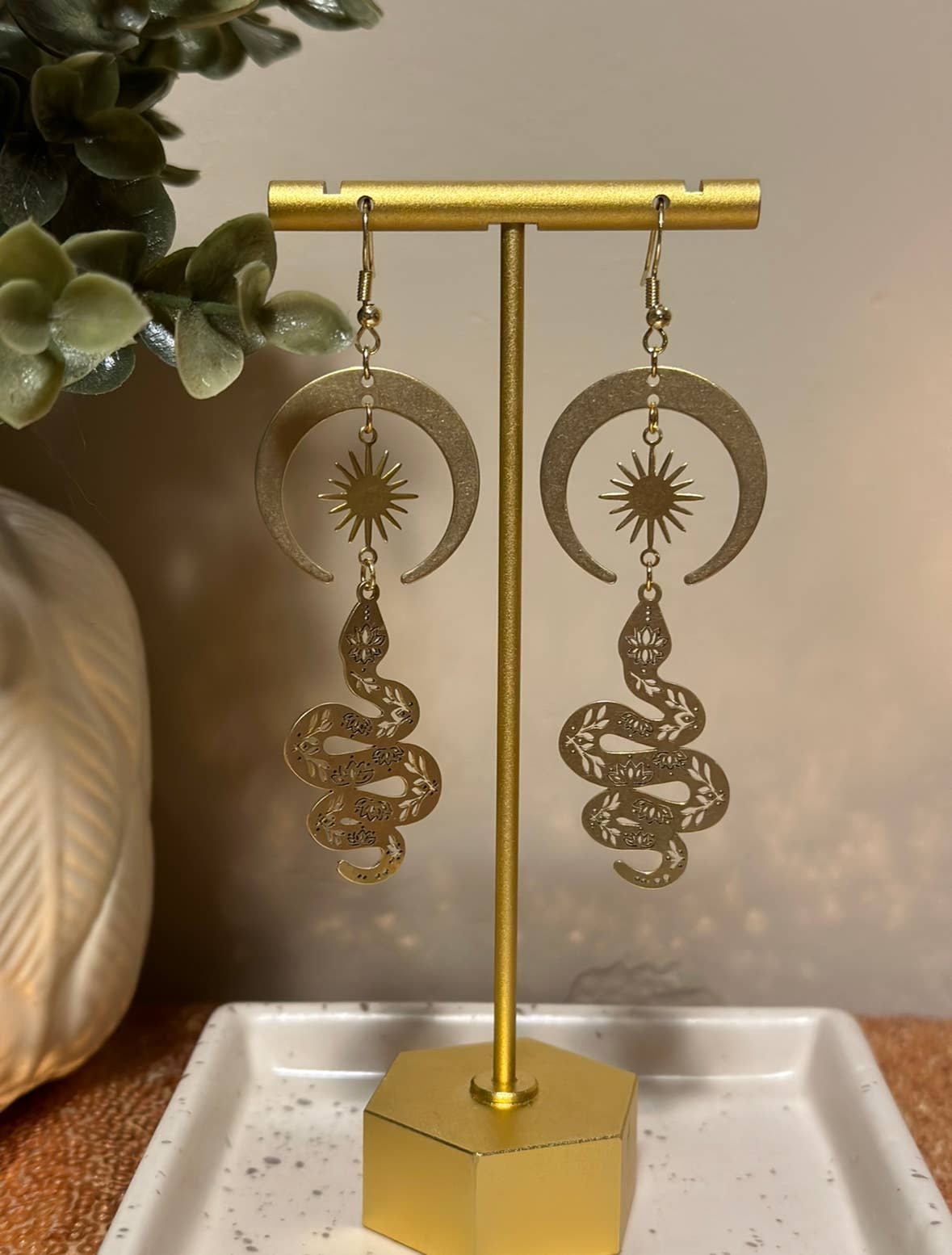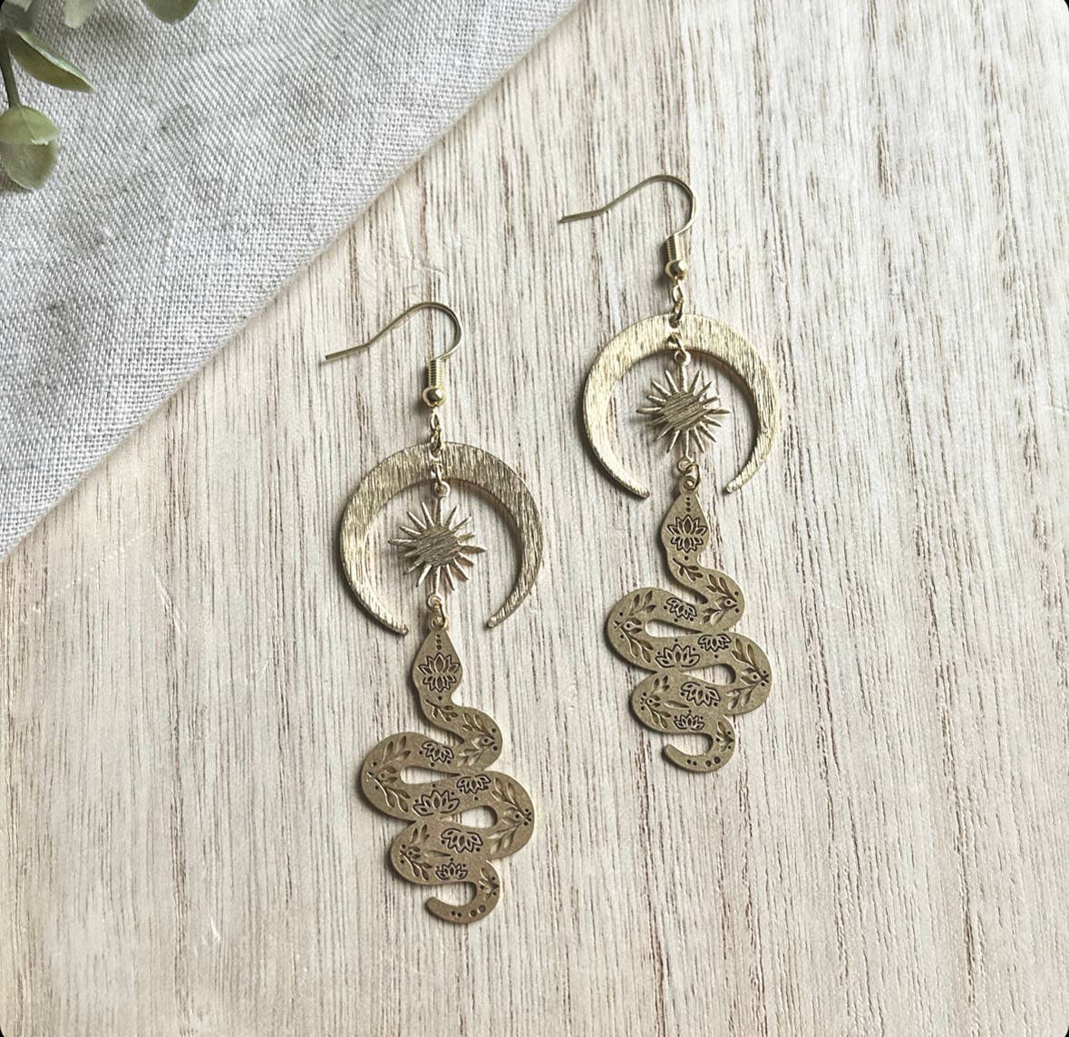 Featuring a snake with lotus cutouts, a crescent moon, and a small sun charm.