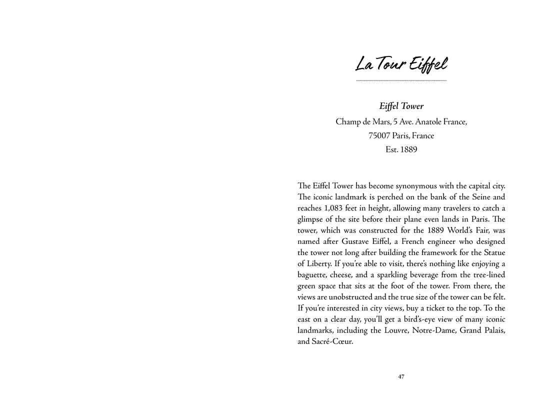 This travel journal features 30 Parisian sites to discover—from the bucket-list worthy must-sees like the Eiffel Tower and Notre Dame to lesser-known gems (like where the locals go for the city’s best baguette). Learn about each landmark with fascinating histories, fun facts, and travel tips. Accompanying journal pages