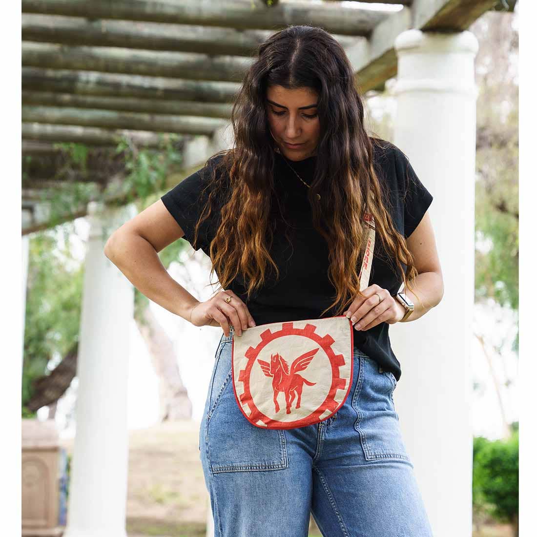 Recycled Cement Bag - Adjustable Crossbody Strap - Zip Closure - Red Cotton Lining