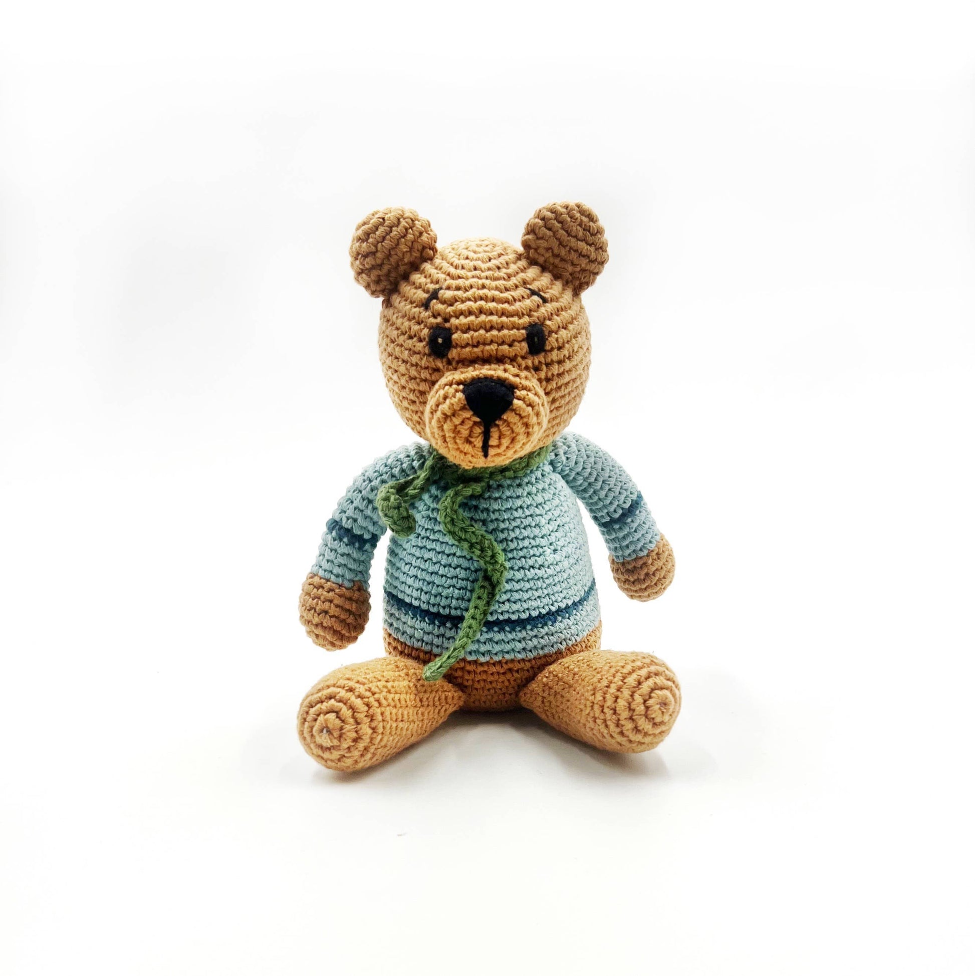 Be sure to stock your shop with these adorable plush toys! Teddy Bear loves to travel and is happiest when taken on trips and cuddled. This stuffed bear loves new adventures! Handmade with soft cotton yarn, this bear is perfect for cuddling.