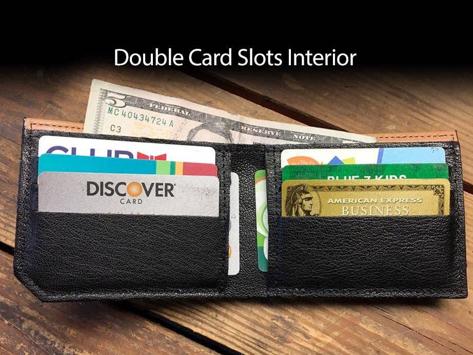 This particular wallet is equipped with with eight card pockets and a cash pocket, so you'll have plenty of room for all of your stuff. However, we still worked really hard to keep it thin enough to easily slip in to your front pocket, too!