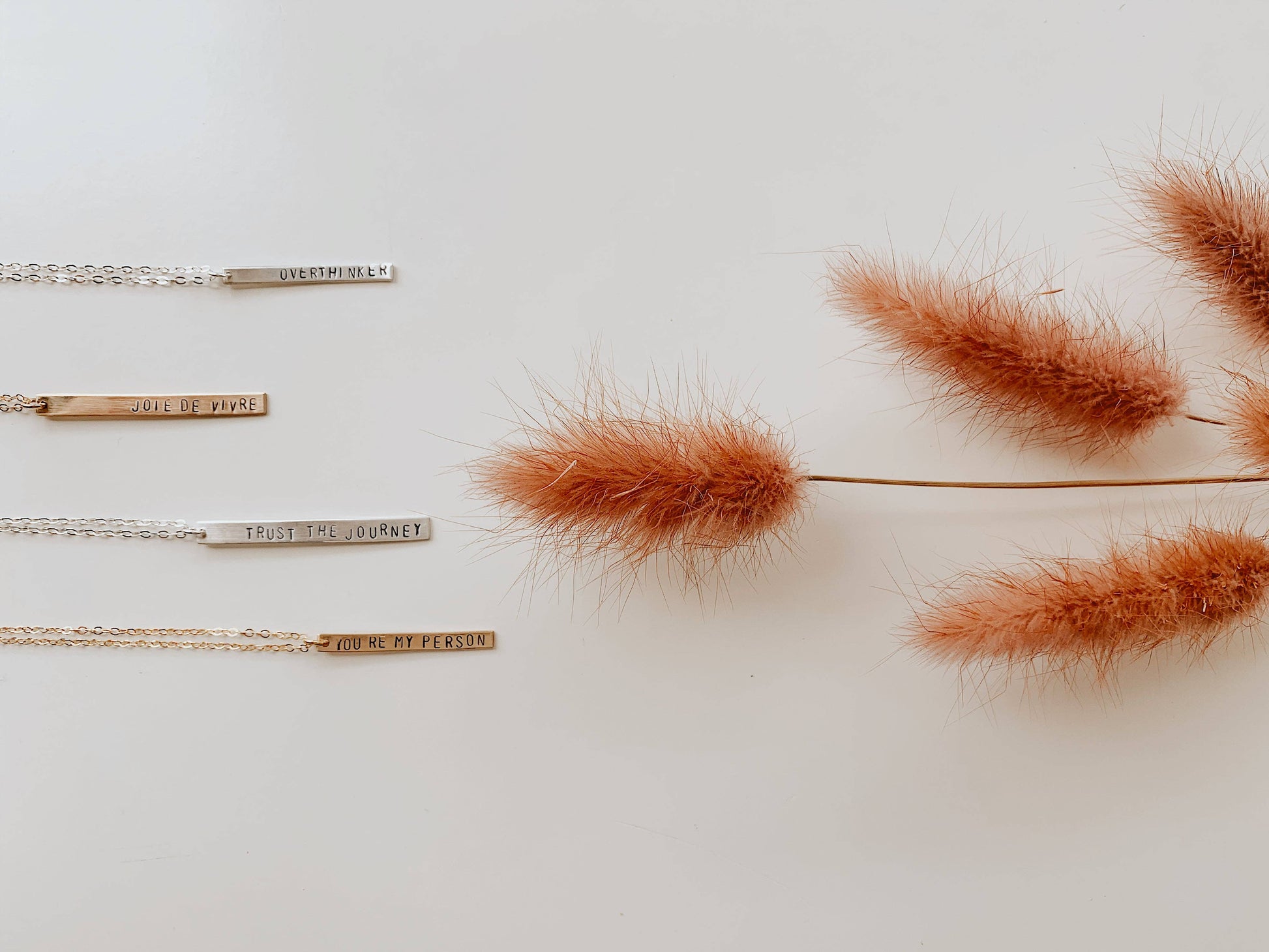 Our classic phrases stamped on a horizontal or vertical bar // Available in Gold-filled or Sterling Silver // 16" chain // Available in Arial font only